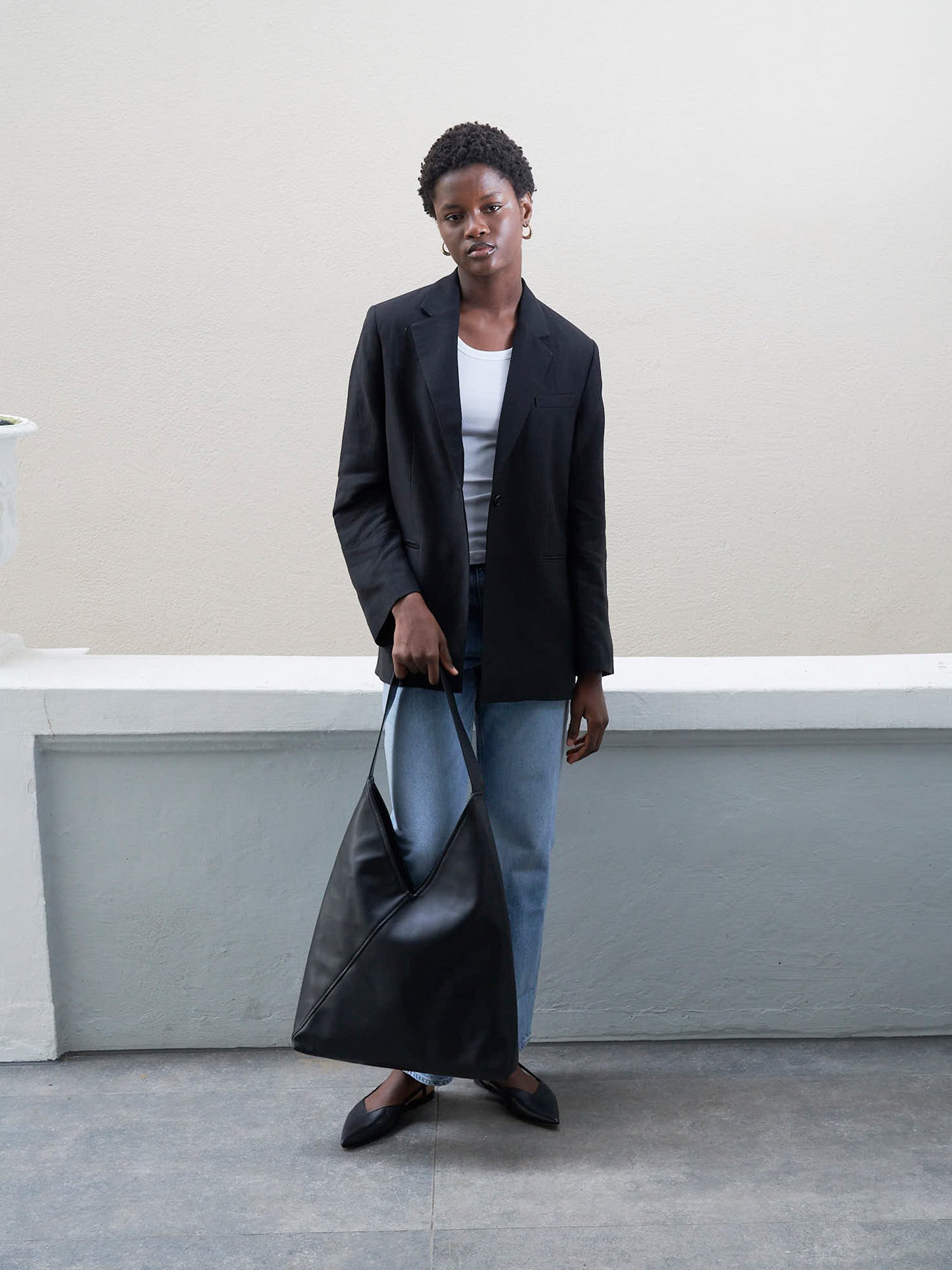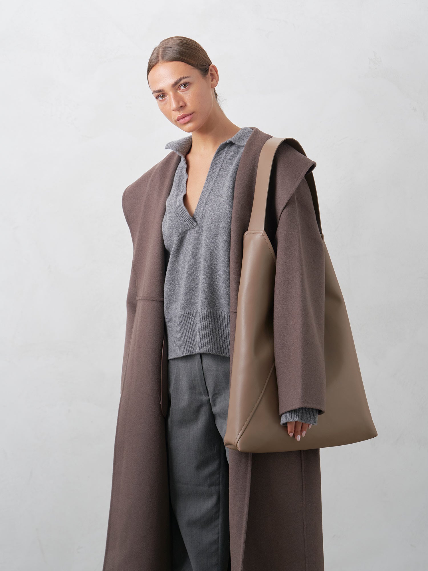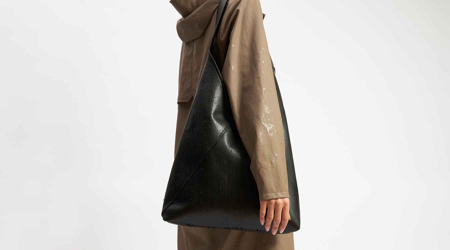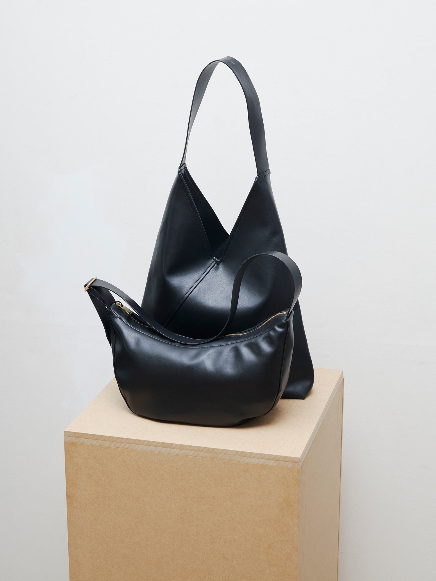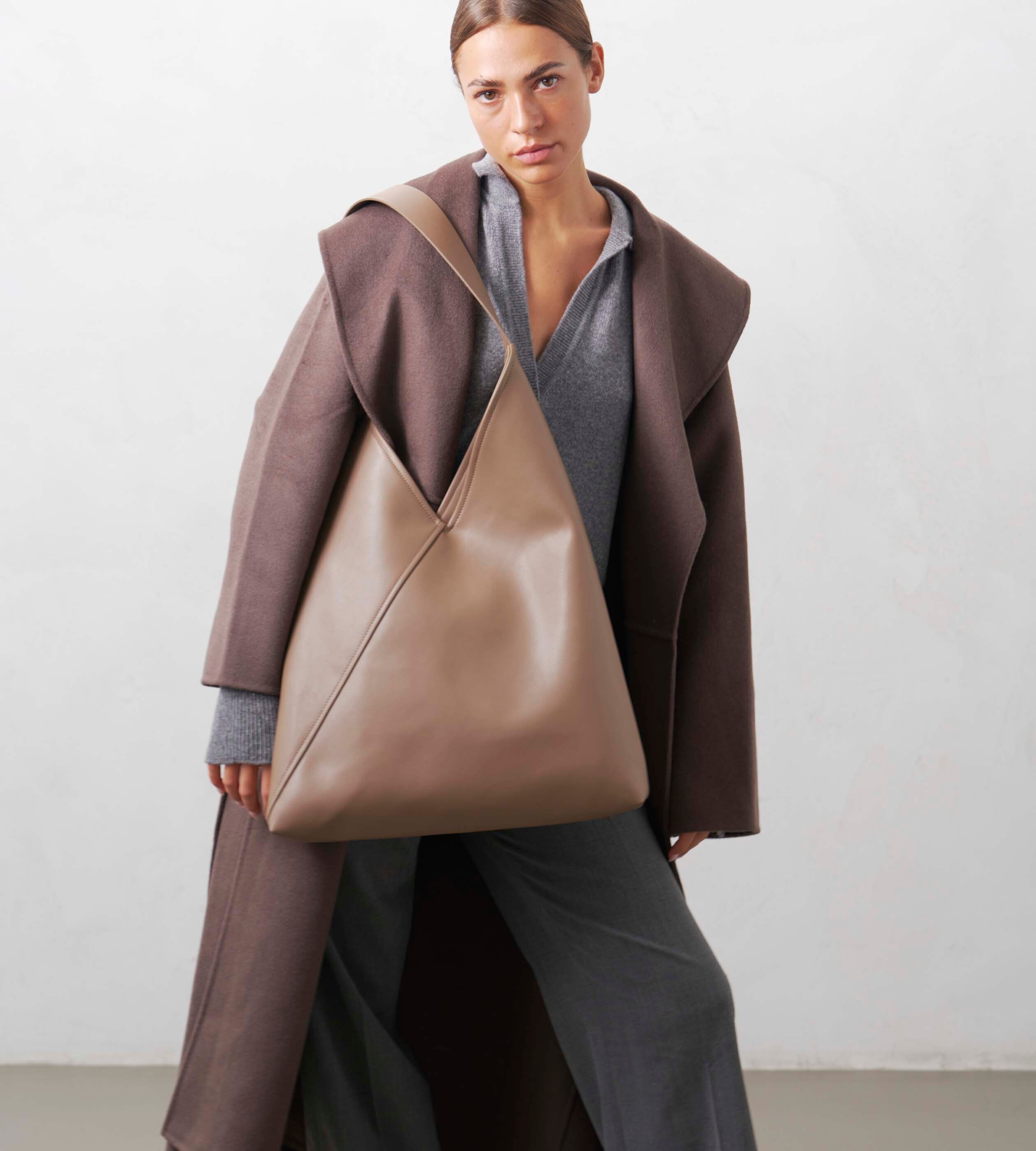 The trapeze-shaped Origami Bag stands out with its timeless look and premium craftsmanship. Made from the vegan leather alternative Oleatex, it is produced from olive industry waste and offers the same visual and qualitative features as animal leather. Inside the bag, there is a closable pocket.