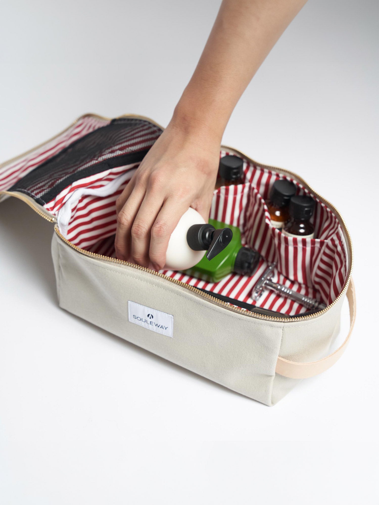 Dieser große Kulturbeutel wird aus wasserabweisendem Canvas gefertigt und mit Details aus pflanzlich gegerbtem Leder versehen. Mit dem minimalistischen Souleway-Look und dem funktionalen Innenleben mit sechs Innenfächern begleitet er dich zuverlässig auf jeder zukünftigen Reise.