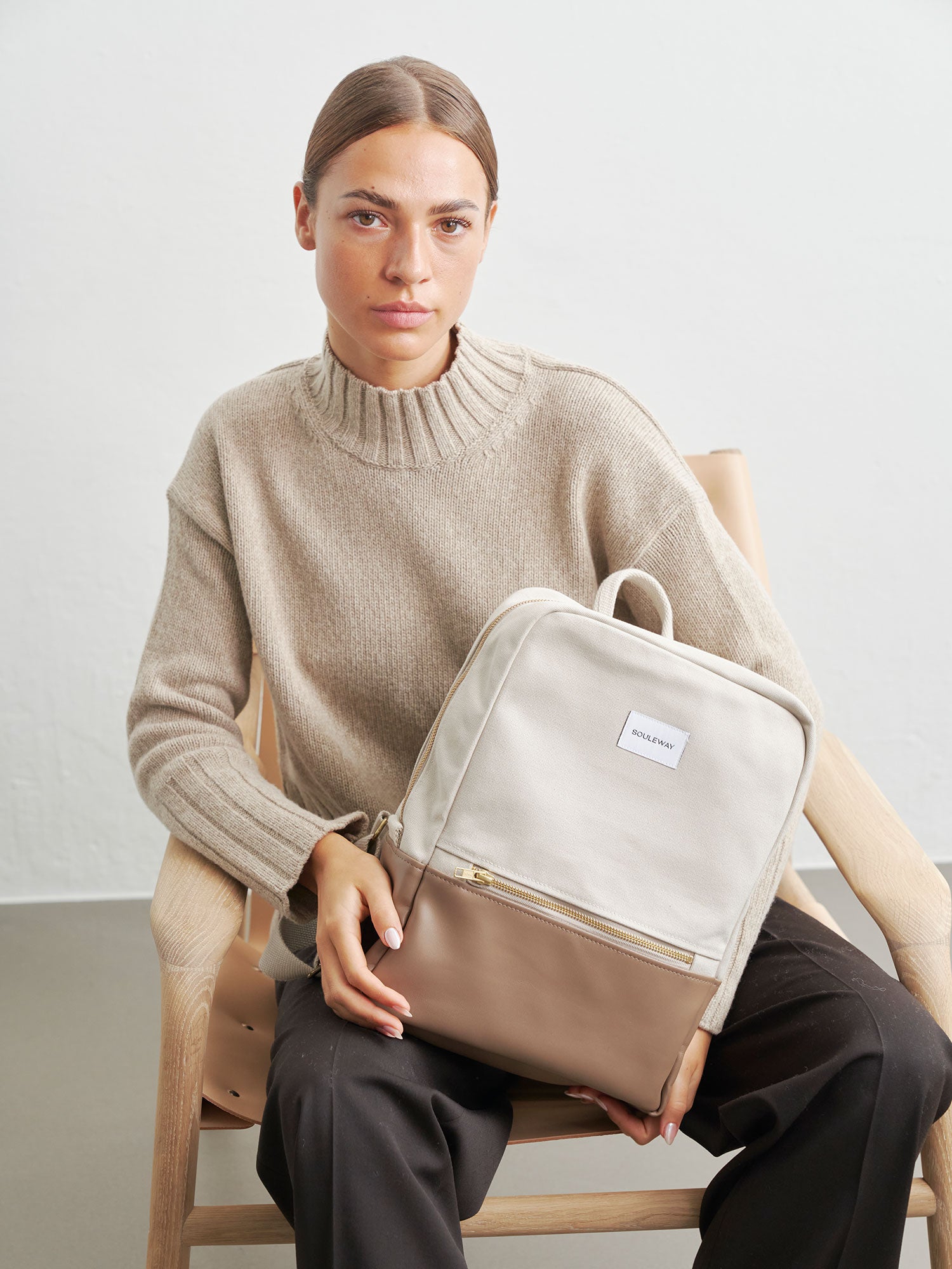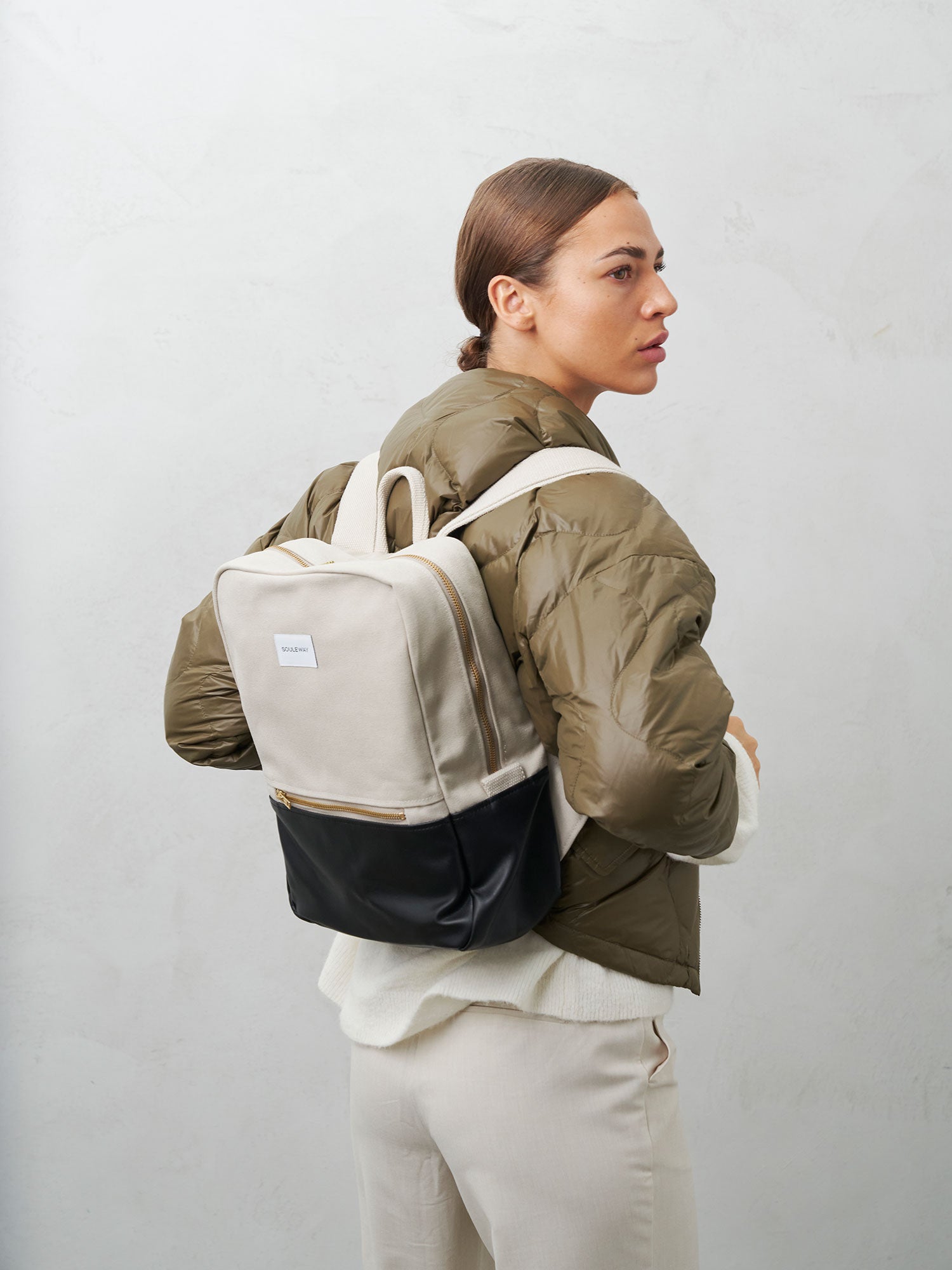 Der Daypack Two-Tone ist eine Variation unseres klassischen Daypacks. Durch die Kombination von Farben und Materialien entsteht ein neuer, sportlicher und dennoch minimalistischer Look. Hergestellt wird dieser Rucksack aus wasserabweisendem Canvas und der veganen Lederalternative Oleatex. Im Inneren des Daypacks befinden sich neben einem 14-Zoll-Laptopfach zwei offene sowie eine verschließbare Tasche. Damit Schlüssel und Co. schnell griffbereit sind, ist dieser vegane Rucksack außerdem mit einem kleinen, verschließbaren Außenfach ausgestattet.